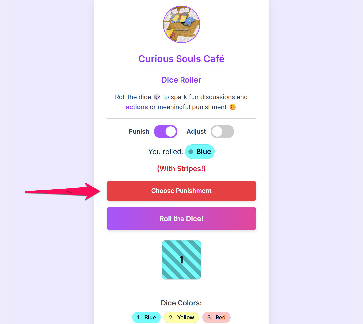 Note: Using the “Punish mode for “punishment” (meaningful actions) is entirely optional. Feel free to skip directly to the discussion once a dice is rolled and a color is revealed.