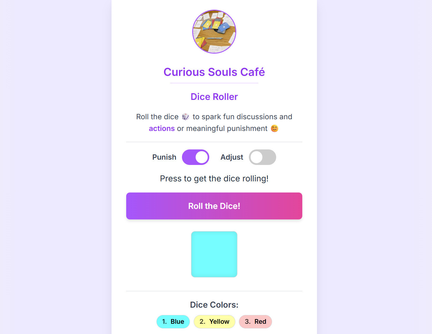 One fun and meaningful way to decide who begins the discussion in a Curious Souls Cafe event is to use the colored dice. This article discusses both the physical dice and the virtual dice roller on the Curious Souls Cafe web app.