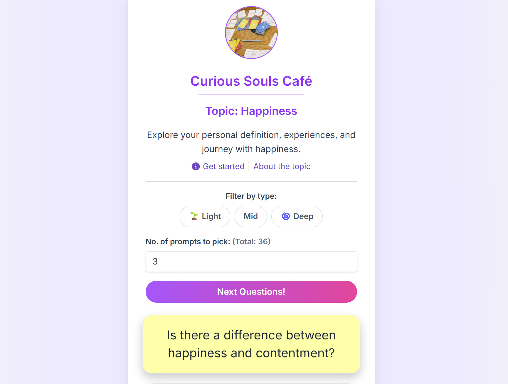 Curious Souls Café aims to foster a collaborative and reflective environment, where individuals engage in a process of shared experience, dialogue, and reflection, and are invited to share perspectives to create meaning and build connections.