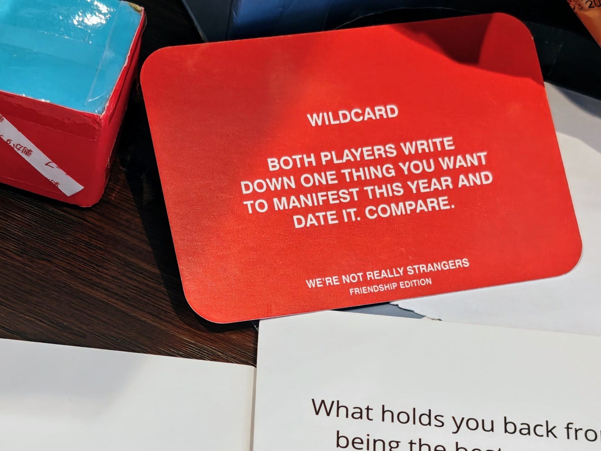 Consider this example. On the left is a striped dice designed for the variation of our game where meaningful “punishment” is enabled. On the right is a meaningful action prompt, or “punishment” card. These cards facilitate bonding and encourage meaningful actions, such as the example shown in the picture: “Write down one thing you want to manifest this year and date it. Compare.” (Note: we are not affiliated with the product.)